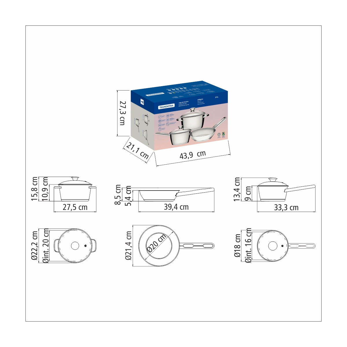 Jogo de Panelas Tramontina Allegra em Aço Inox com Fundo Triplo 3 Peças