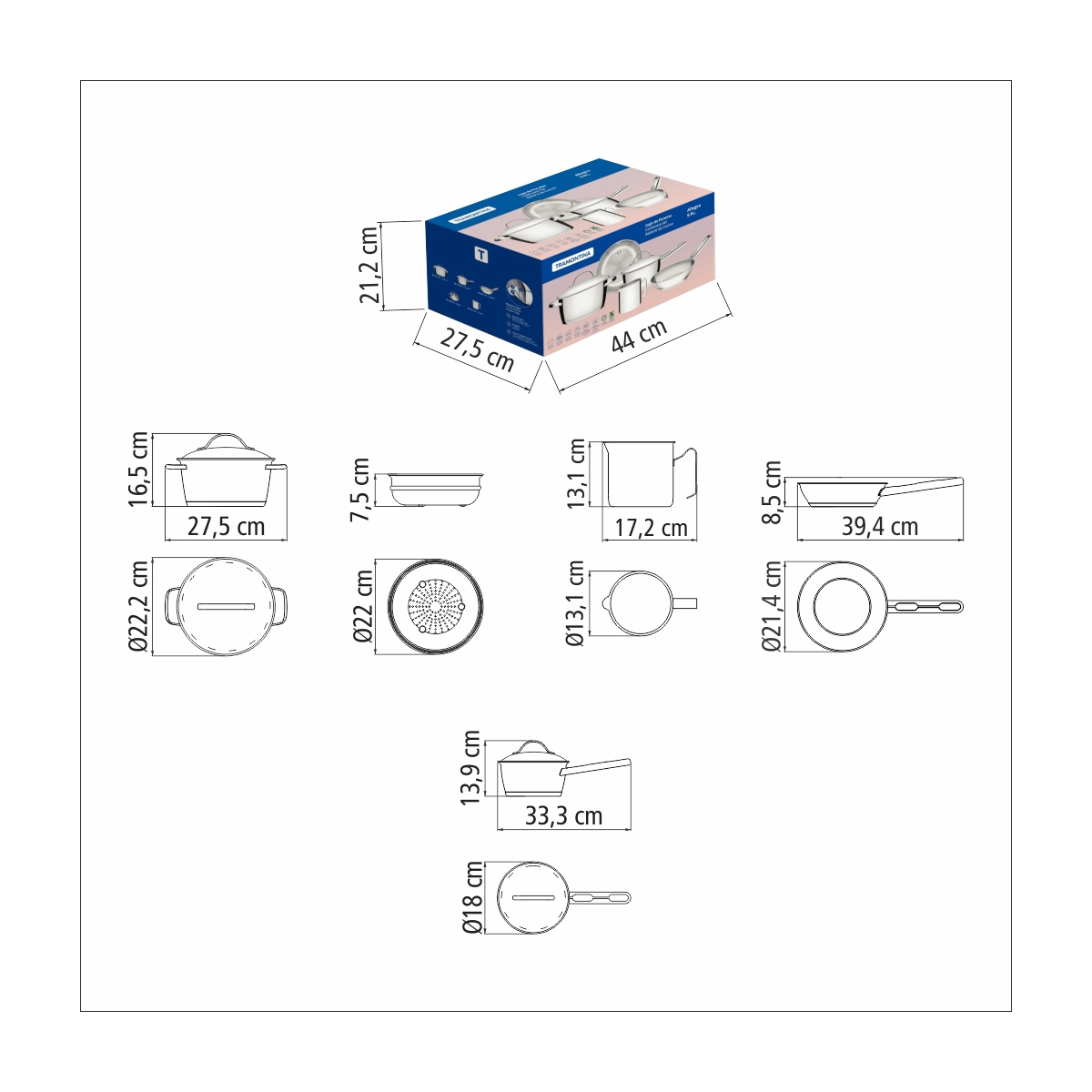 Olá, Samira. Tudo bem? Desejo que sim. Segue as dimensões: Fervedor: Diâmetro de 12 cm, altura e largura de 13,10 cm, capacidade de 1,40 L. Frigideira: Diâmetro de 20 cm, altura de 6,80 cm, largura de 22,40 cm, capacidade de 1,30 L. Panela: Diâmetro de 16 cm, altura de 13,90 cm, largura de 18 cm, capacidade de 1,50 L. Caçarola: Diâmetro de 20 cm, altura de 16 cm, largura de 22 cm, capacidade de 3,1 L. Cozi-Vapore: Diâmetro de 20 cm, altura de 0,8 cm, largura de 22 cm. Atenciosamente, Equipe Tramontina 💙